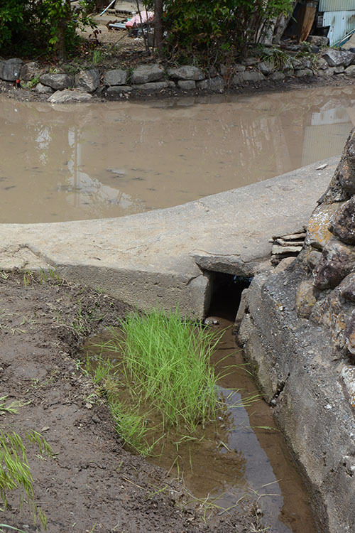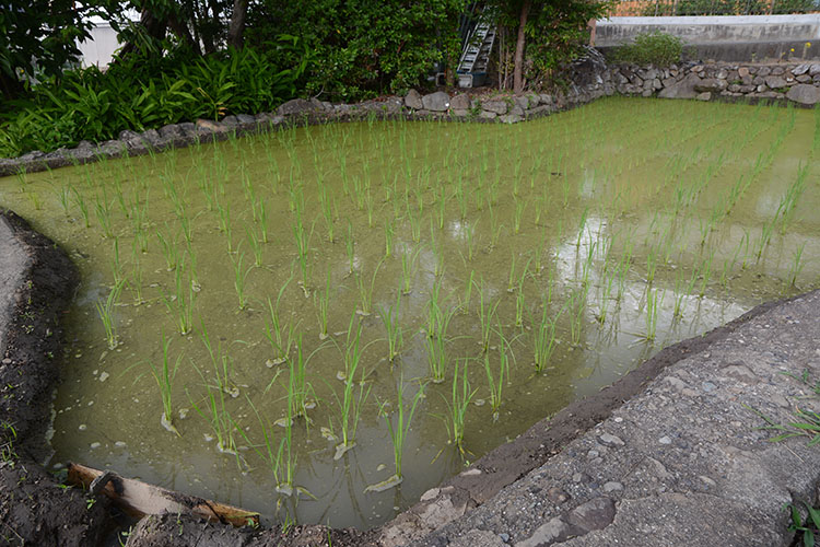 アオミドロが一面に発生。これまで除草のために時々棒でかき混ぜていたのに。いったん水を抜いてアオミドロを除く。アオミドロを発生させないようにするには、松の枝を田んぼに挿すと良いというのでやってみた。松ヤニがアオミドロの増殖を抑える効果があるらしい。