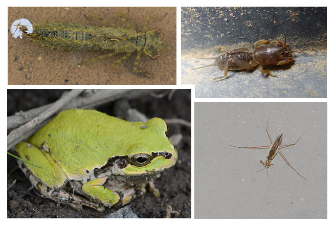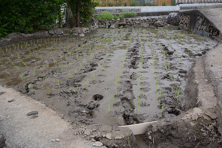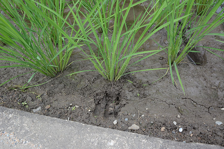 田んぼに鹿の足跡。稲が二、三束倒されていた。幸い、この後、鹿の侵入はなかった。田んぼにはいろいろな小さな生き物が見られる。