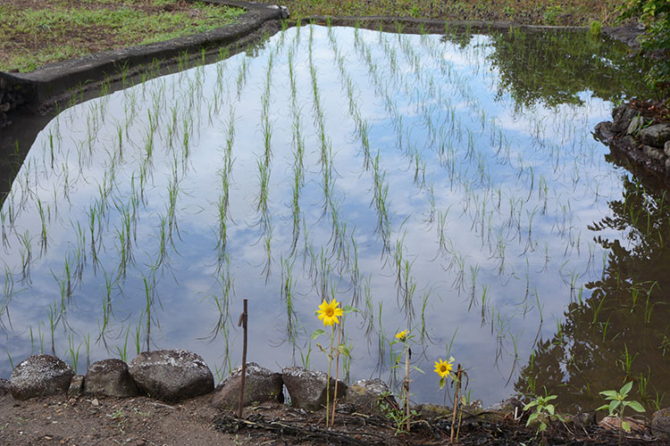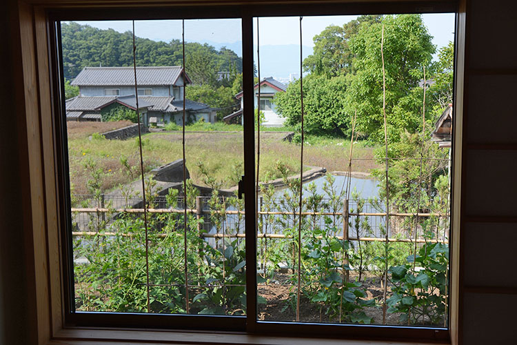 自宅の居間から田んぼが見える。田んぼの前景は家庭菜園。