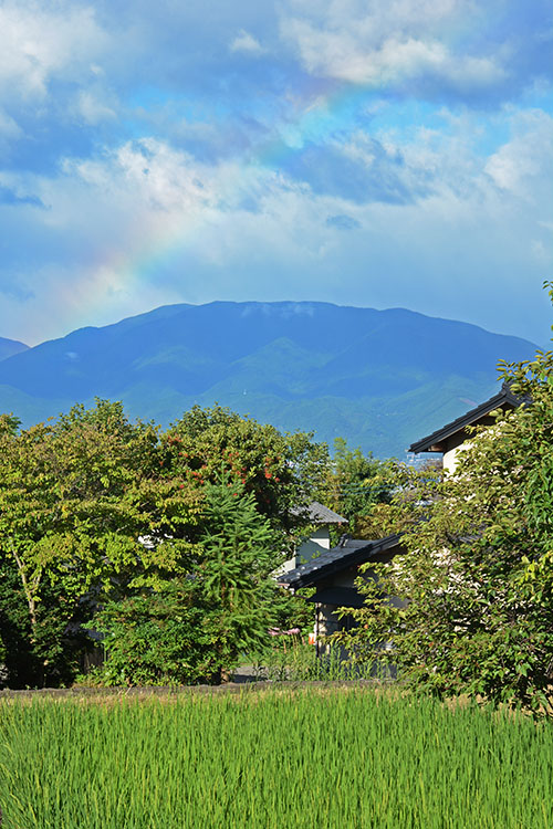 右の写真は、8月10日の朝。田んぼの向こうの櫛形山に虹がかかった。