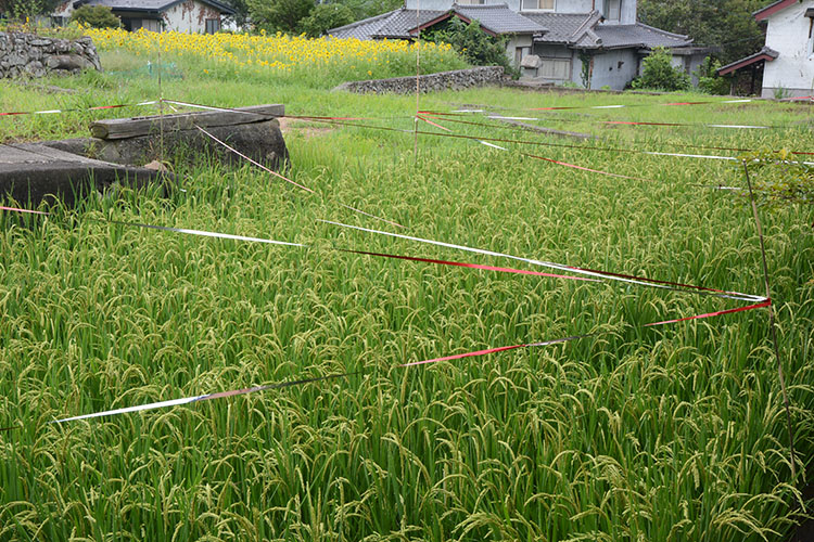 稲の穂が大きくなって雀が来るので、鳥よけのテープを張った。雀は全国的には減少しているようだが、この付近ではよく見かける。稲は初めは米粒のかたまりではなく籾の中にミルク状になっていて、これが育って米粒になるとのこと。一つつぶしてみたら確かに白いものが流れてきた。雀はこれを吸い取るらしい。