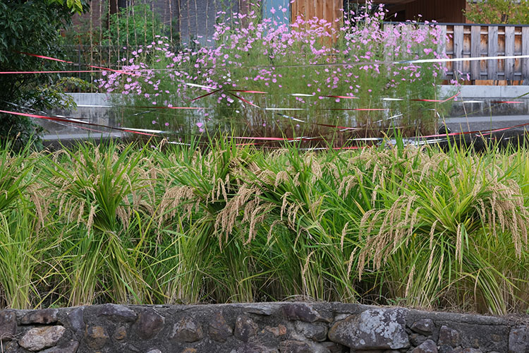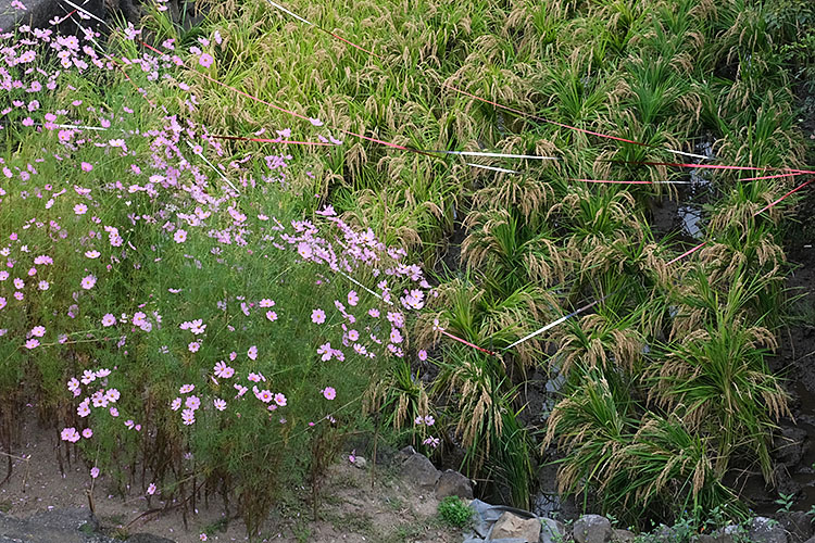 稲が倒れてきたので、三、四束ずつ麻ひもでくくって倒れるのを防ぐ。田んぼの北側に撒いたコスモスが満開になった。