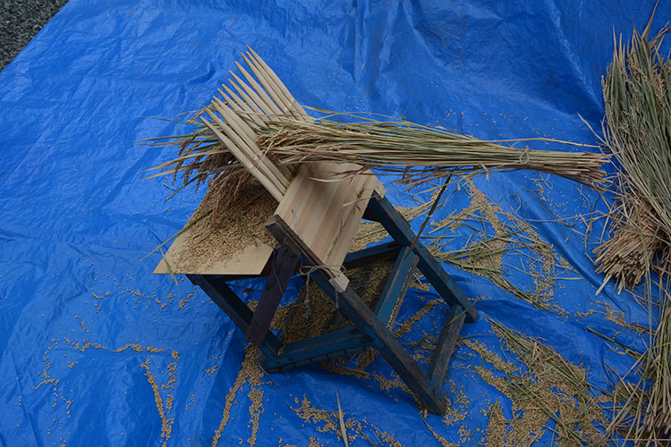 竹で歯を作り、ひっくり返した古いイスに取り付けた「千歯こき」で脱穀。少しずつ作業したため、すべて脱穀するのに一週間かかった。
