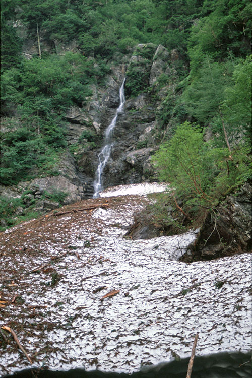 左俣は沢を何回も渡りながら進む。途中、臭いと思ったら、カモシカの死骸があった。左俣大滝付近には大量の雪。ここから急登。雨が降り出し、カッパを着た。