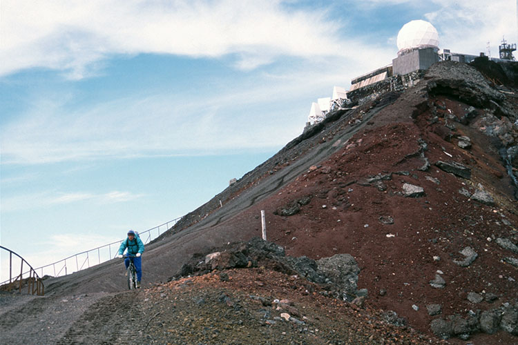 神田は剣ヶ峯から五合目登山口までをほとんどMTBに乗ったまま走り下る。御殿場口下山道の砂走りや宝永火口の中を砂煙を立てて凄い速さで走る様は、見ていて怖くなった。私は砂走りを走って下る。靴底の減りが激しい。捨てる寸前の靴を履いてきたのは正解だった。神田は所々で私を待っていなければ、30分くらいで下ってしまっただろう。私もつられて1時間で1000mも下ってしまった。スキー山岳部OBの神田はスキーで山頂から滑ったこともあるそうだ。