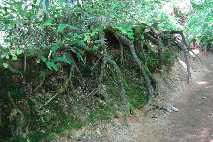 中房から燕への道は三大急登とかいわれる登りだが、道は良く休憩のベンチも適度にあるので、それほど大変ではない。登山道の途中に木の根が張りだしていて、昨日見てきた映画「千と千尋の神隠し」の“釜爺”みたいだと子供が言うので、写真に撮る(下左)。