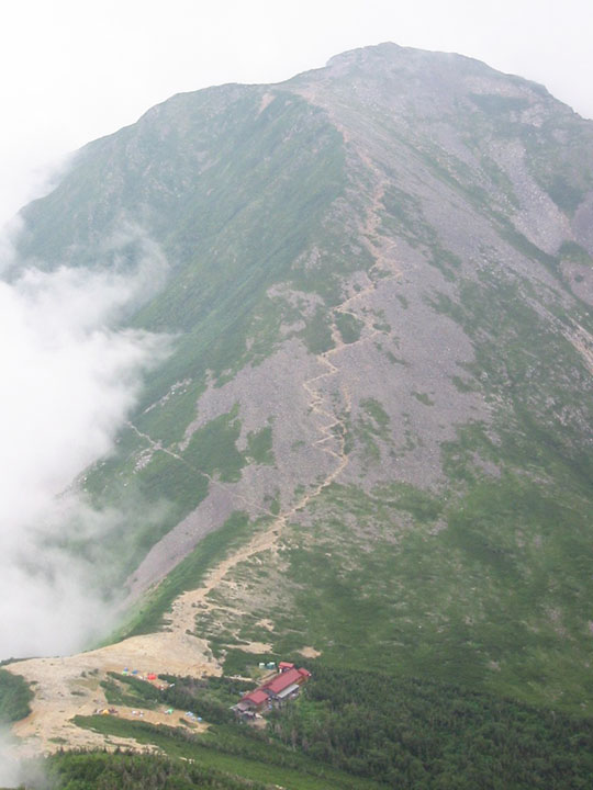 朝からあいにくの雨。今年の北アルプスは晴れ続きで、この雨は20日ぶりとか。期待していた燕山荘から大天井岳を経て常念小屋までの縦走は、無展望の歩きとなってしまった。