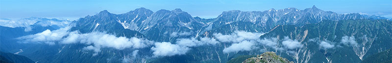 常念岳山頂からのパノラマ(ここをクリックすると、拡大写真が別ウィンドウに表示されます。)