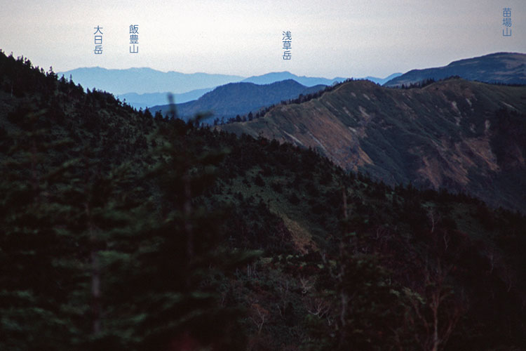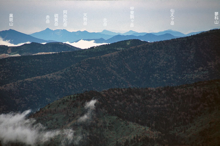奥秩父の山並みの上に富士。富士山の右に大きな浅間山、そこから右へ八ヶ岳、南アルプス、北アルプス、戸隠妙高の山々と続く。山頂避難小屋の向こうには米山、その遠方に佐渡島の山並みが意外に大きく見える。東側は白砂山と佐武流山が大きく、その向こうに尾瀬や日光の山並み。明日歩く烏帽子山に重なって苗場山と越後駒ヶ岳、左手遥かには帰ってから調べたフィルムに飯豊山らしきものが写っていた。