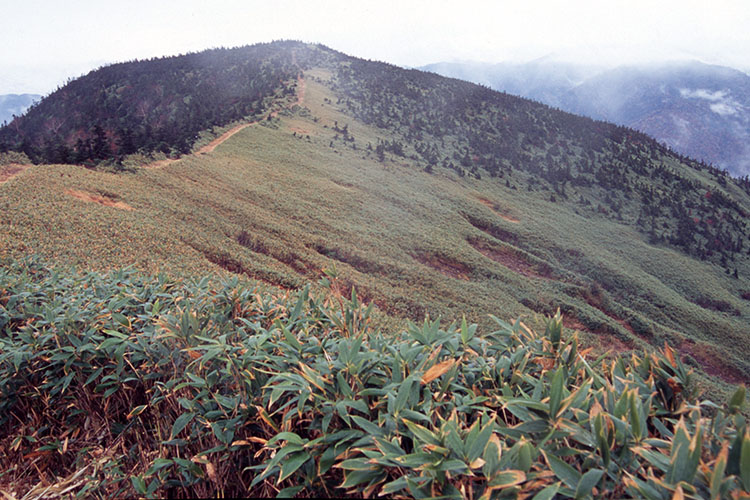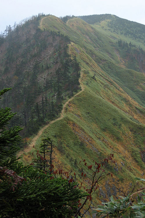 夕焼けがあったのに、夜は一晩中、雨と風が激しく続いた。こんな時は、小屋の有り難さをつくづくと感じる。朝になると、風は治まり雨も小降りになってきた。天気が良ければ絶好の展望がひろがるであろう尾根道を裏岩菅山から烏帽子岳に向かう。鳥帽子のように尖ったピークは「中岳」とあり、烏帽子岳はこちらから見るとなだらかな大きな山だった。