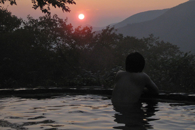 | <煙草屋旅館> | <露天風呂> | <露天風呂からの夕日> |