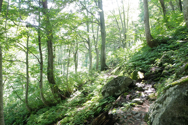 冷水沢の吊橋を過ぎ、次の吊橋を渡ってしばらく進むと、ブナ林の中の急登となる。登りながらヤマアジサイの写真を撮っていると、若い女性が下りてきて声をかけられた。後でわかったことだが、この人が以東小屋の管理人だった。急登が終わり平らな道に出れば大鳥小屋は近い。大鳥小屋の前に、以東小屋に泊る人は大鳥小屋で宿泊者数の状況を確かめてから行くようにという意味の看板が出ている。大鳥小屋の管理人に聞くと昨夜の以東小屋は12人のグループ(先ほどすれ違った人たち)を始め25人が泊ったが、お盆休みも終わりなので今日はかなり少ないだろうとのこと。今年の夏の天気は異常で、昨日あたりからようやく良い天気になったそうだ。
