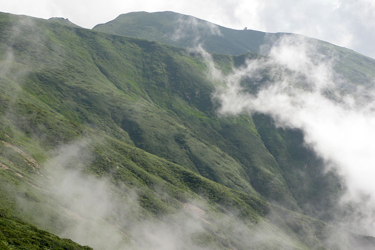 以東岳への登りはオツボ峰コースをとる。標高1400m付近まで登ると草原状になり、池塘も現れてくる。黄色いニッコウキスゲがちらほらと咲いている。よく見るとピンクのユリが二、三輪。ヒメサユリのようだ。登山道沿いには青紫のミヤマリンドウが多い。チングルマはすべて綿毛になっていて、花があるのは紫のタカネマツムシソウとミヤマリンドウで、つぼみのリンドウもたくさんある。白いのはハクサンイチゲとウメバチソウか。