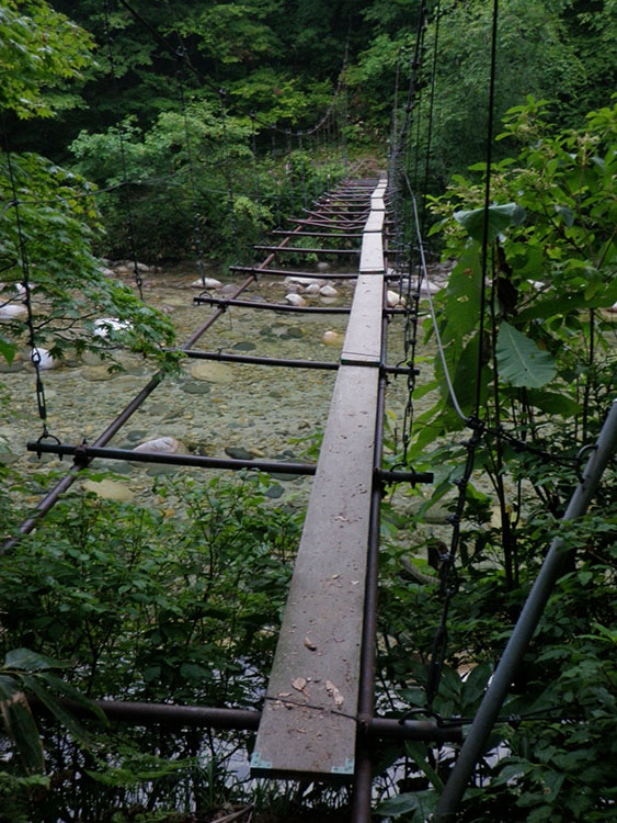 角楢吊橋を渡り、次の白布吊橋は下に最近つくられたらしい潜り橋を渡る。潜り橋は、川の中にコンクリートブロックを隙間をあけて並べてあるもので、増水した時には水没して、橋が流されたり壊されたりしないように考えられているらしい(四万十川の沈下橋の簡易版みたいなものか)。細くて不安定な吊橋よりも渡りやすい。吊橋は下流ほど立派になってきて、3番目の大石吊橋は幅が広い(が、片側に細い板が渡してあるだけだった)。茸採りの人たちがやってきて身軽に吊橋を渡っていった。大石吊橋を渡ると林道が来ていて、ここまで車が入れる。プレハブの公衆トイレがあった。