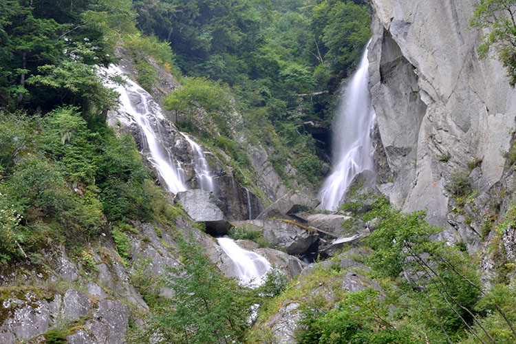 五色ノ滝、白糸ノ滝を見て、鳳凰ノ滝はやや遠そうなので息子と二人で向かう。途中から倒木と藪を抜けて沢へ下りると滝が見えた。後から来た六、七人のグループは途中の薮であきらめたようだ。