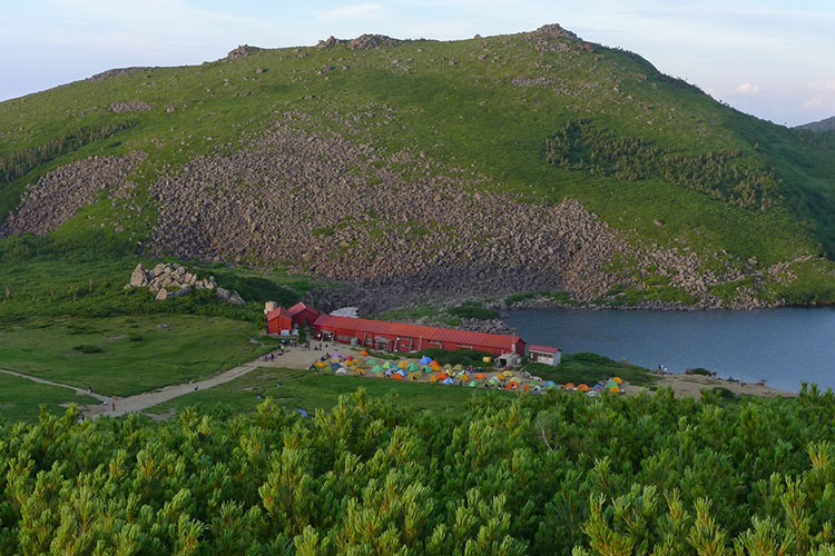 天狗山荘は黒い屋根と壁の新しい建物になっていた。食事も鍋物など、白馬大池山荘のカレーとは違って工夫されていたが、布団が濡れたように湿っぽいのは何とかしてほしかった。二階に仕切ってあるうちの下段は天井が低く、狭苦しい。トイレも男女兼用で数が少ない。早く着いて時間があったので食堂で高校野球を見た。おじさんのグループはテレビを見ながら800円の生ビールを何杯もお代わりしていた。