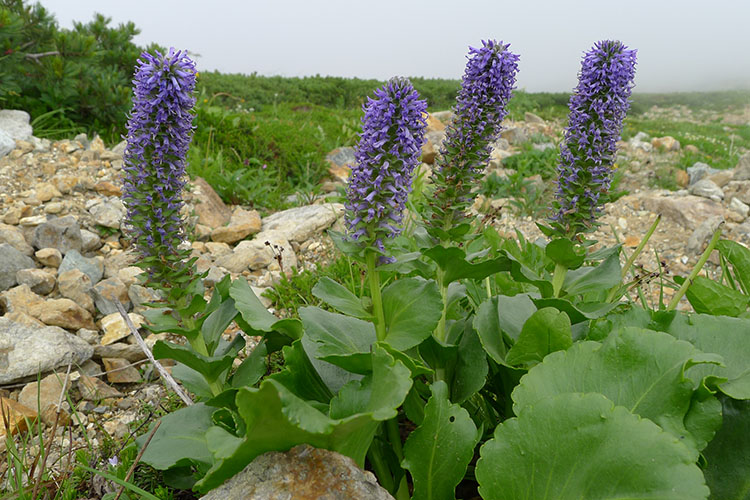 杓子岳の山頂を目指す人が多いが、我々はトラバース道を行く。白馬鑓ヶ岳周辺は蛇紋岩が多い。ウルップ層の群落はほとんど枯れていた。