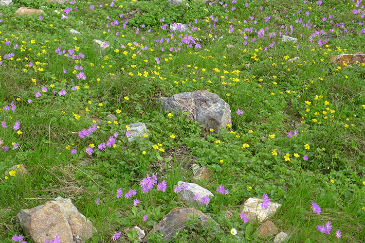 山荘前の草原にハクサンコザクラの群落があったがロープで近寄れない。夕日を見に大池西側の稜線に行く。雪倉岳に日が沈んだ。