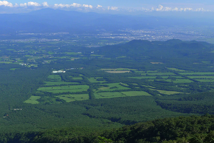 遠くに見えた鋭角の山は何かと下りて来た人にたずねたらそれが鳥海山だった。鳥海山だと思っていた山は森吉山だった。すると鳥海山の右手前は秋田駒ヶ岳か。森吉山の右手遠方に岩木山。頂上に着くと、北に八甲田山が見えた。