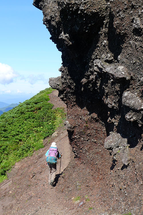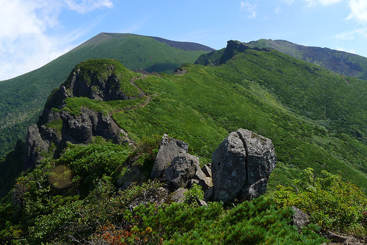 不動平から鬼ヶ城へ登り返し、稜線コースを歩く。アップダウンがあり、岩がゴツゴツして歩きにくい。網張温泉からであろう登山者の集団が登ってきた。