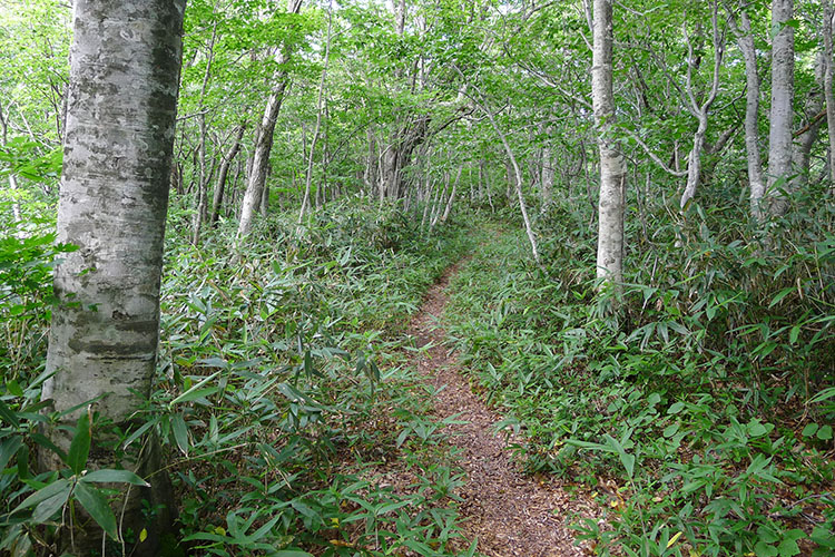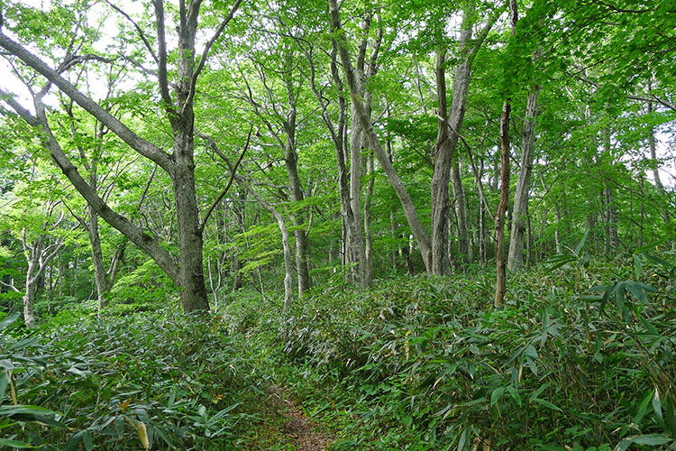 姥倉山からの下りは、石がゴロゴロした沢の中で、湿っている所が多い。途中で植生が変わって、明るいブナ林になった。