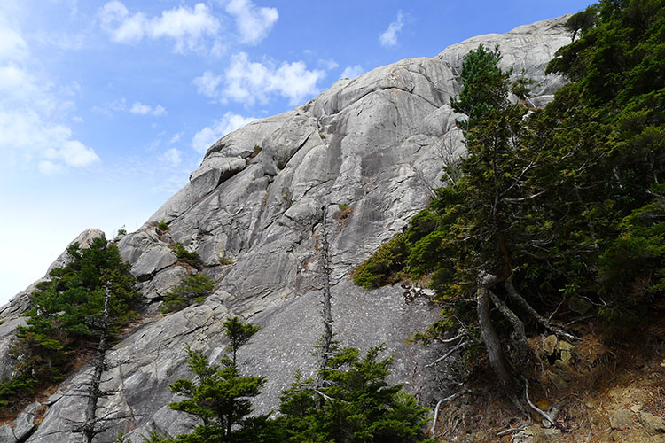 林が切れて南アルプスが見える所で昼食。大日小屋の広場には、何人も休んでいた。ややわかりにくい登山道を右手に進み、大日岩の下に出る。大日岩のピーク直下まで登ってみた。