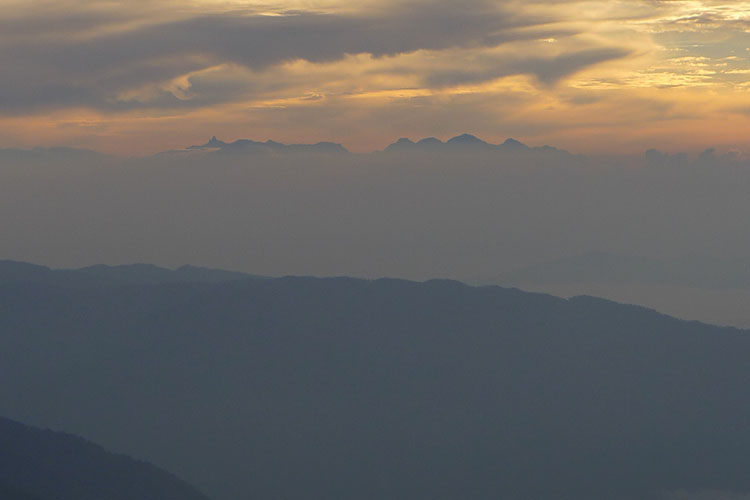 昨夜は星空だったのに、起きたら曇り。展望コースを登ると、展望台では雲の上に北アルプスの山頂部が見えた。槍穂、乗鞍、御嶽が、わずかの間見えていた。