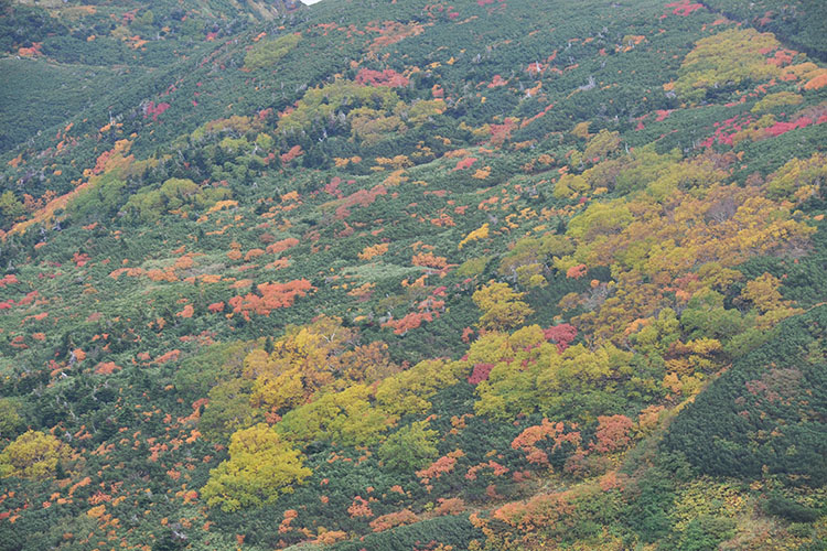 加賀禅定道に入ると、ほとんど人がいない。清浄ヶ原の斜面の紅葉が美しい。登山道沿いにはコケモモが熟していたので、少し採集して、帰ってからジャムにした。百四丈の滝は、最初、ガスで全く見えなかったが、しばらく待っているとガスが動いて、姿を現した。