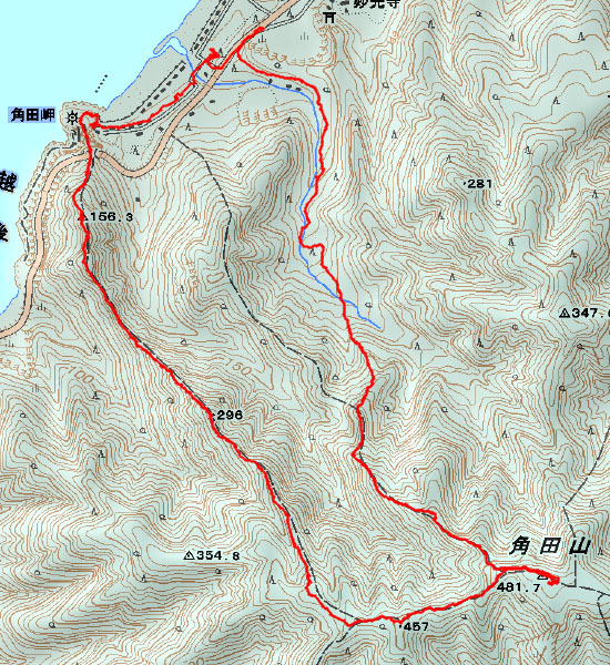 - 岩室温泉 8:05 ⇒ 8:25 角田浜 8:40 → 9:00 沢の入口 → 9:50 桜尾根に合流 → 10:35 灯台コースと合流 → 10:40 角田山 11:00 → 13:15 灯台 → 13:30 角田浜