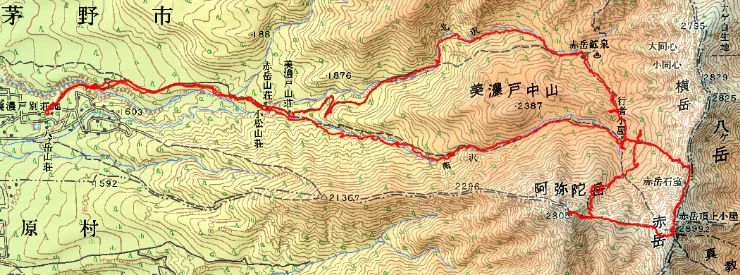 - 行者小屋テント場 5:16 → 6:20 天望荘 → 6:50 赤岳 7:25 → 7:58 中岳 → 8:07 分岐 → 8:30 阿弥陀岳 8:50 → 9:08 分岐 → 9:44 行者小屋テント場 10:40 → 12:27 美濃戸山荘 → 12:33 やまのこむら 12:35 → 14:10 美濃戸口