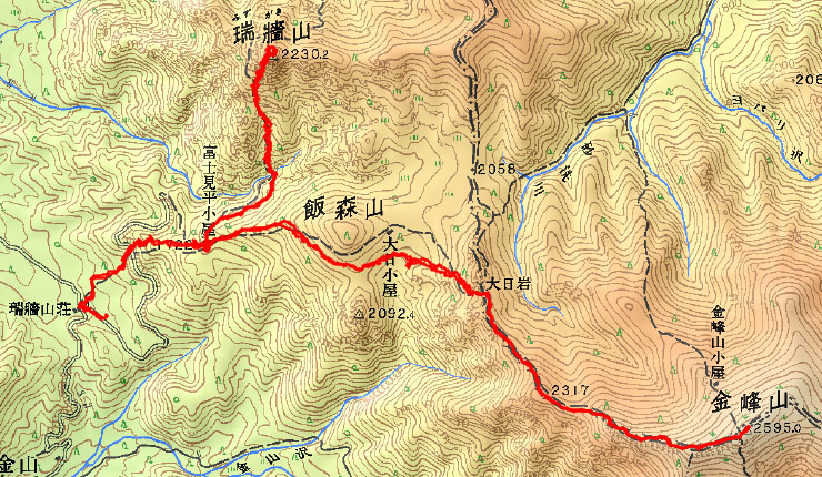 - 富士見平 5:05 → 5:55 大日小屋 6:00 → 6:30 大日岩 6:40 → 7:35 砂払ノ頭 → 8:15 金峰山 8:40 → 9:20 砂払ノ頭 9:25 → 10:02 大日岩 10:07 → 10:27 大日小屋 10:35 → 11:15 富士見平テント撤収昼食 12:05 → 12:42 駐車場