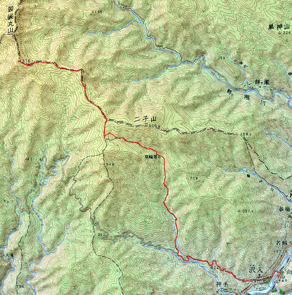 - 沢入駅 14:25 → 15:15 不動滝 → 15:41 塔の沢登山口 15:47 → 16:40 寝釈迦 16:45 → 17:32 賽の河原避難小屋